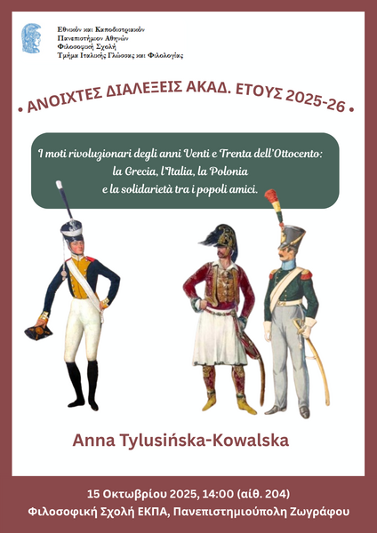 Το Τμήμα Ιταλικής Γλώσσας και Φιλολογίας του Εθνικού και Καποδιστριακού Πανεπιστημίου Αθηνών, σας προσκαλεί στη διάλεξη της Καθ. Anna Tylusińska-Kowalska, Πανεπιστήμιο της Βαρσοβίας (Katedra Italianistyki, Uniwersytetu Warszawskiego) με θέμα: